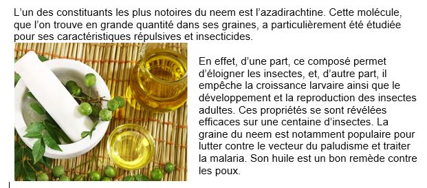  Le Neem Azadirachta indica A. Juss est une espèce arborescente disponible partout dans les villages en zone sahélienne et dont les extraits aqueux sont efficaces contre les insectes ravageurs de plusieurs cultures;