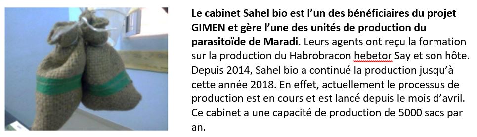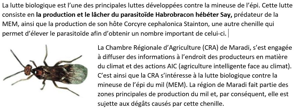 La lutte biologique contre la chenille mineuse de l’épi de mil se fait aussi avec les boites de lâcher du parasitoïde Habrobracon hebetor Say. Les boîtes de lâcher permettent une libération